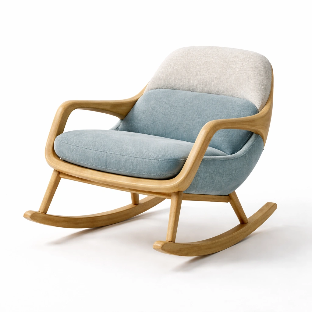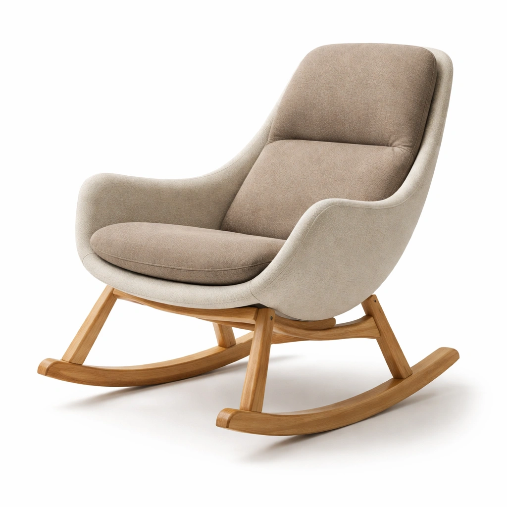 Silla mecedora de tela beige con base de madera de haya