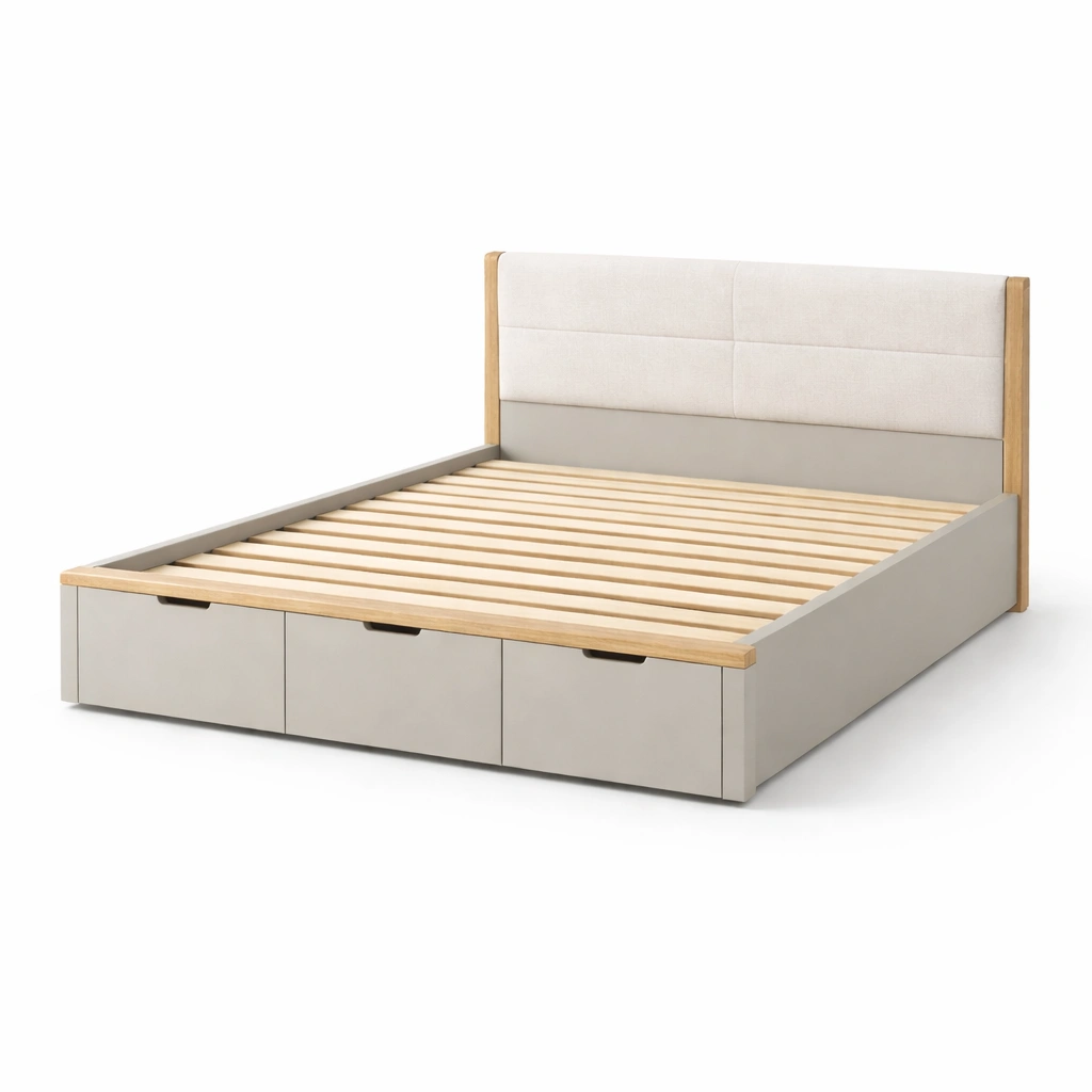 Materiales: Estructura de madera de pino, cabecera tapizada en tela de poliéster, cajones de MDF