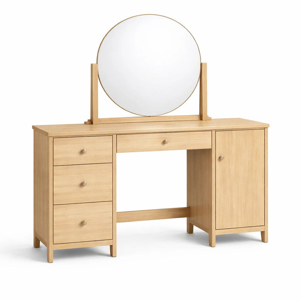 Características: Incluye un espejo redondo, tres cajones y un gabinete para almacenamiento